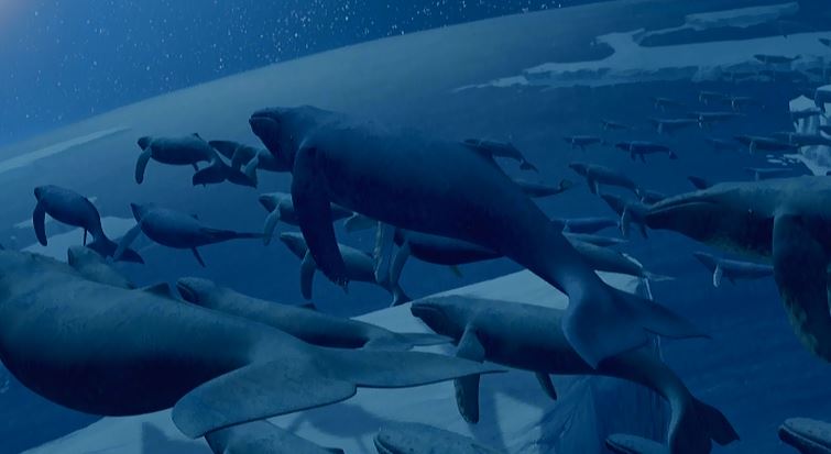Seemingly all at once, the pod of space whales breached the surface of reality, showering the sky with light in fourth dimensional color. The behemoths spouted stardust in a massive exhale, relieved at their return from a long journey outside of time. One by one, an entire host arrived. With a fizzling of refracted photons and a slight ripple of quantum foam, they began to fill the vast, convex horizon of the Earth. First came the huge, kilometer long bulls, but soon after came their calves closely escorted by their mothers.